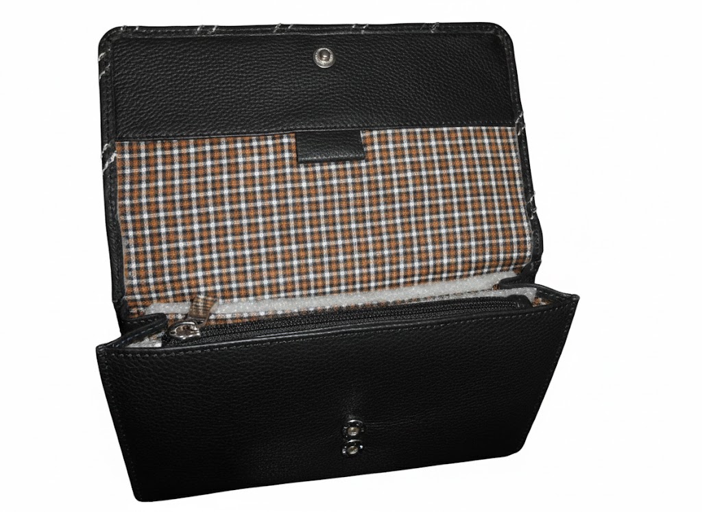 A sophisticated, black pebble-grain leather wallet featuring a stylish gingham-patterned interior and a secure snap-button closure.