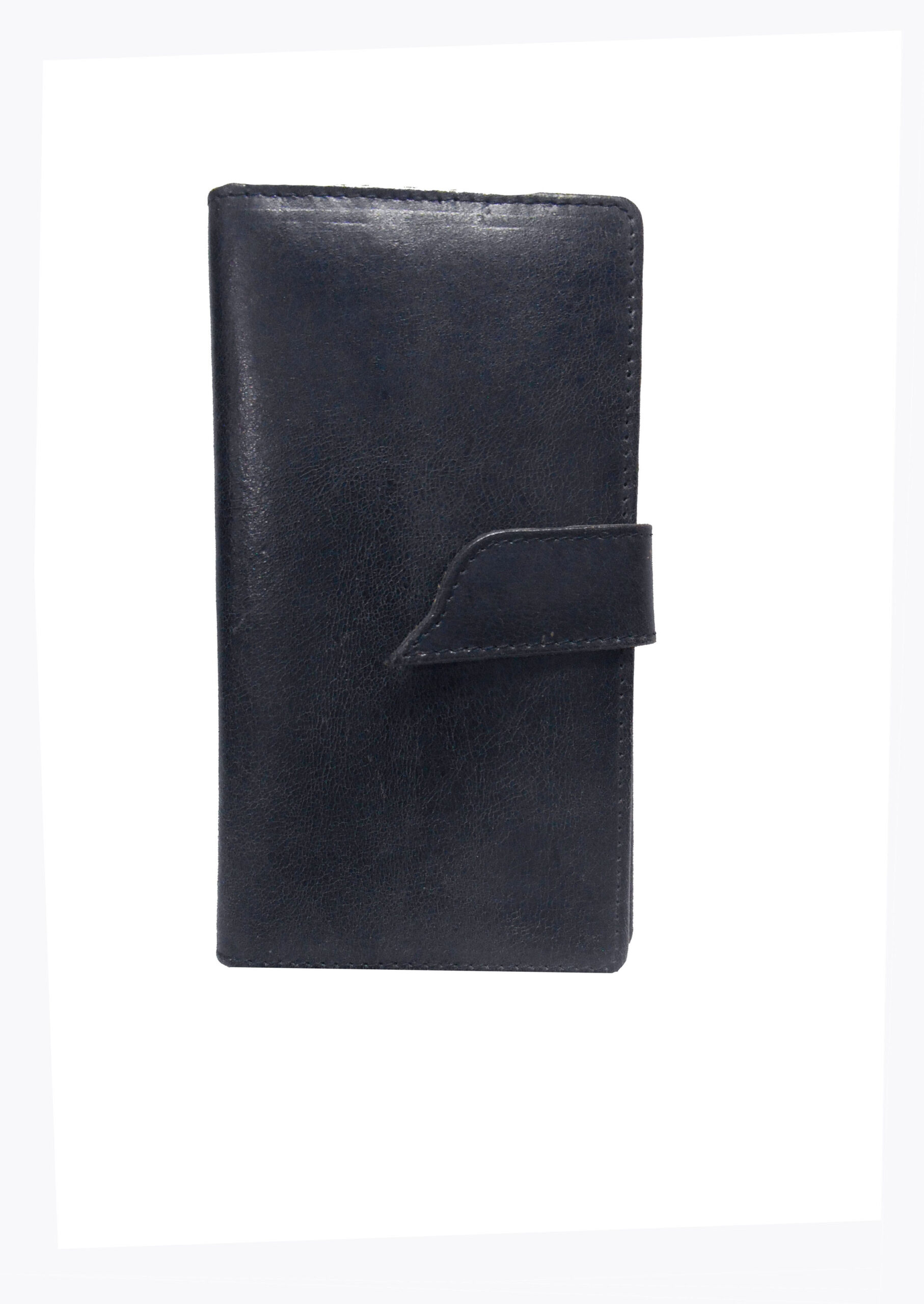 Sophisticated long wallet crafted from premium crackle-finish leather in an elegant navy tone. Designed with a secure snap-button flap closure, this wallet offers a sleek profile while providing ample storage for cards, cash, and daily essentials