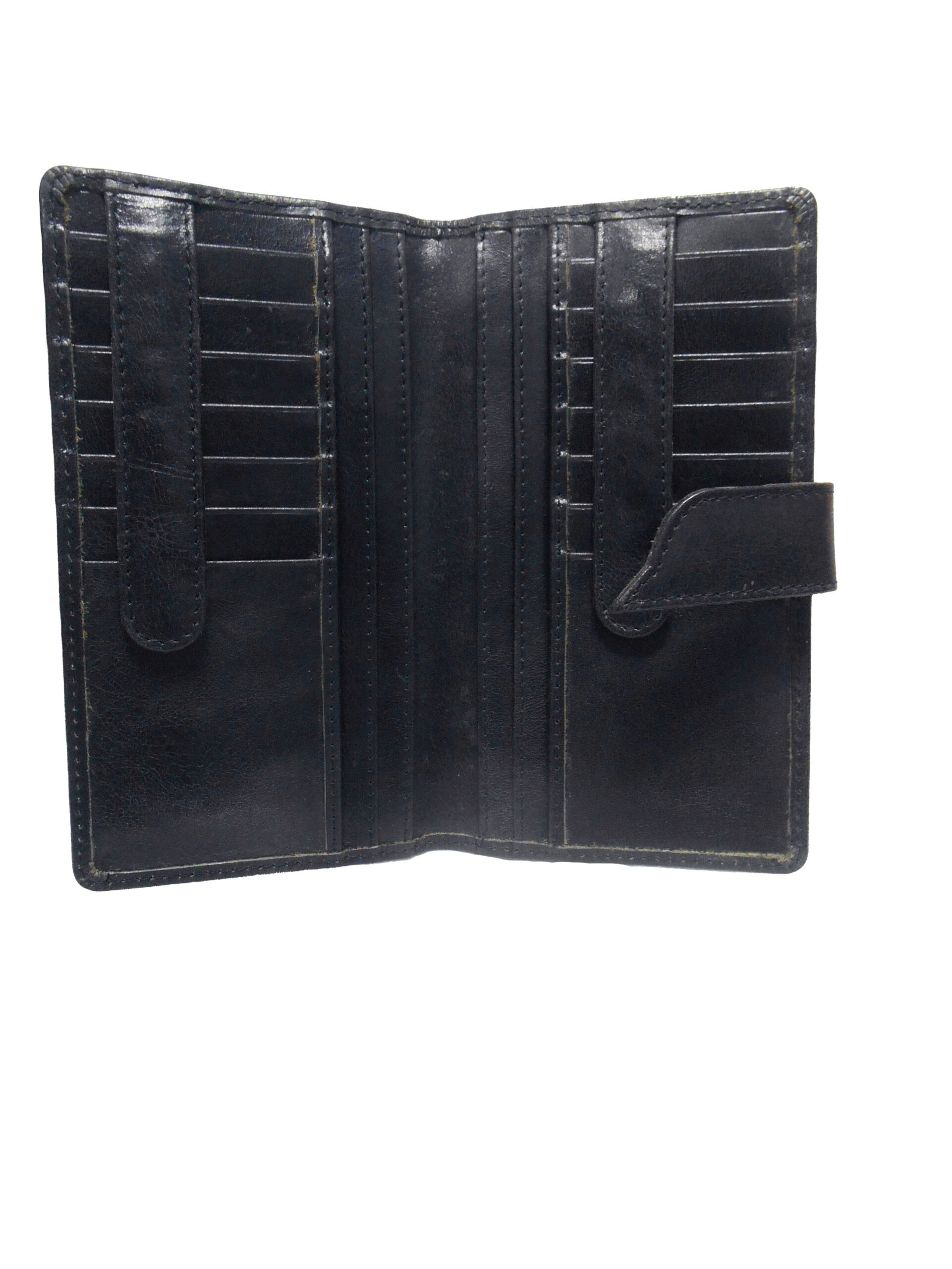 Premium long wallet crafted from high-quality crackle-finish leather in a classic navy shade. Designed for superior organization, it features multiple card slots on both sides, spacious cash compartments, and a secure snap-button flap closure