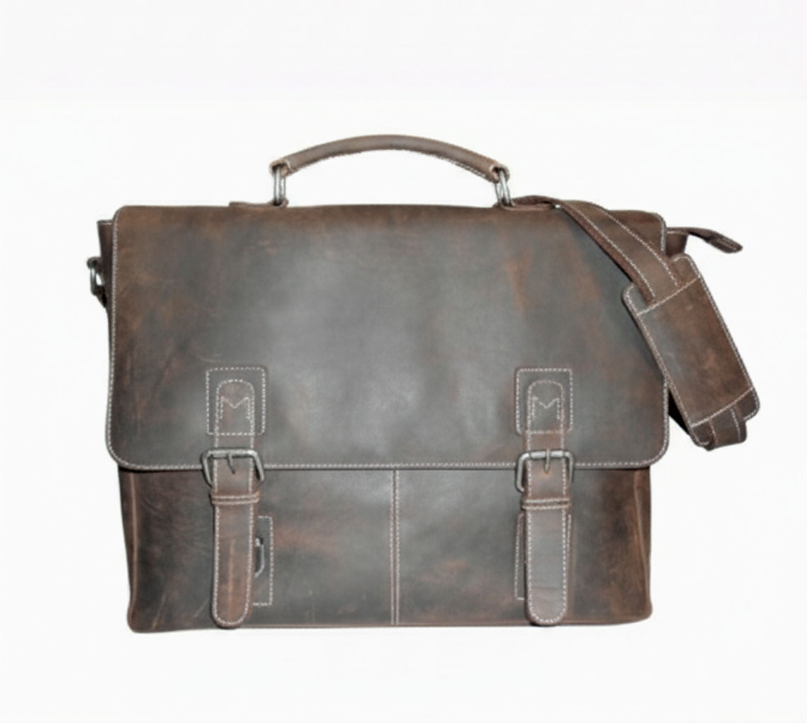The interior comfortably fits a laptop, documents, and daily essentials, making it ideal for professionals and frequent travelers. A sturdy top handle and an adjustable, detachable shoulder strap offer versatile carrying options. Durable stitching and antique-finish hardware enhance its rugged yet elegant appeal.