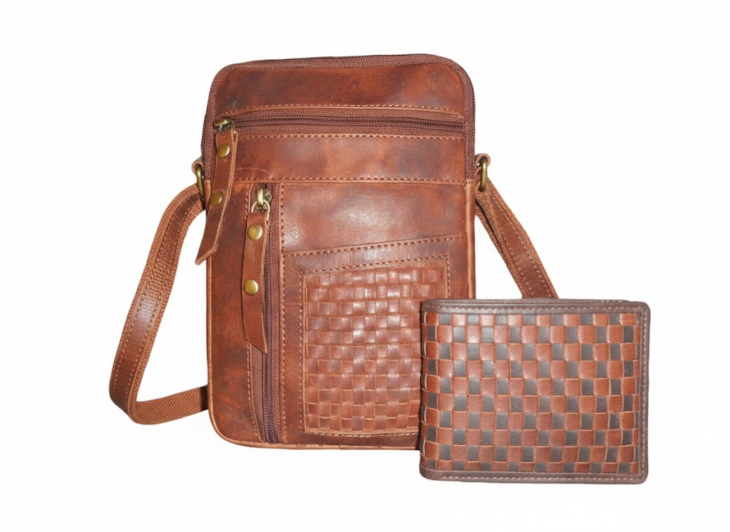 A premium two-piece set featuring a vertical cross-body bag and a matching bifold wallet, crafted from rich cognac-toned leather with signature hand-woven accents for a timeless, textured look.