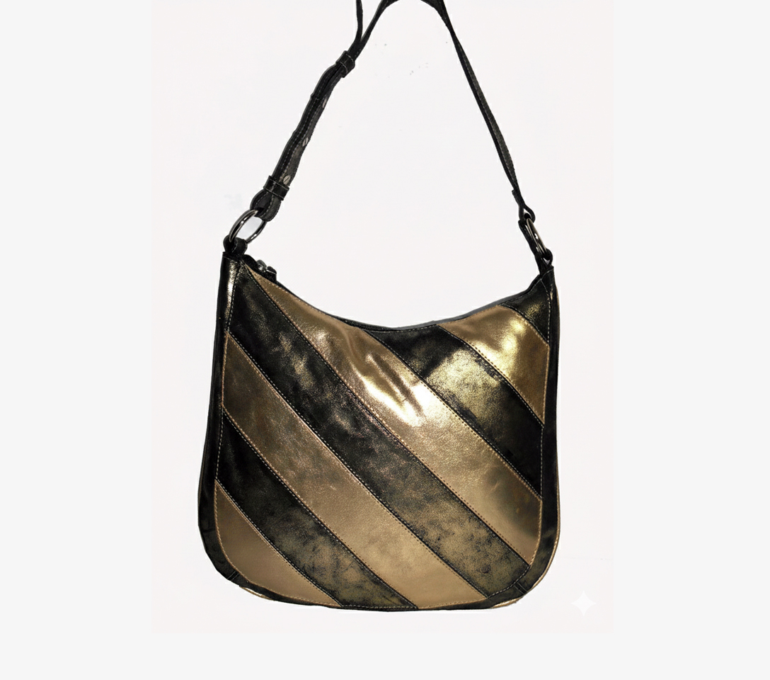 Bold and contemporary, the FR 2122 Shoulder Bag features striking diagonal panels in metallic gold and distressed black genuine leather. The soft, slouchy silhouette offers effortless style, while the adjustable shoulder strap ensures comfortable wear.