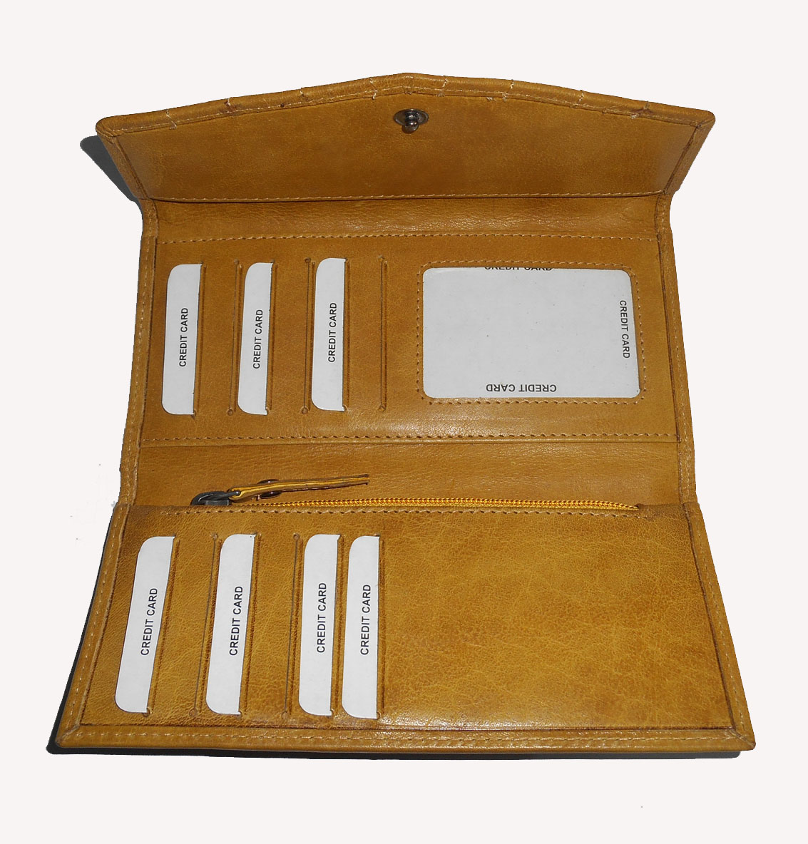 The wallet opens to a well-organized interior featuring multiple card slots on both sides, a transparent ID window, spacious cash compartments, and a secure zippered pocket for coins or small essentials. The sturdy flap closure with a snap button ensures your belongings stay safe while maintaining a sleek silhouette.