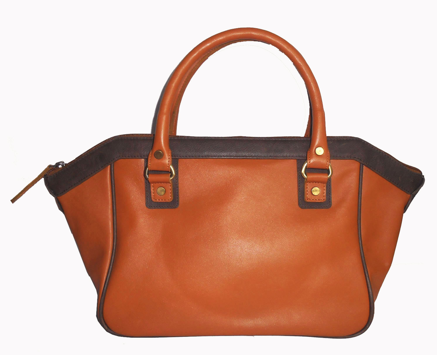 Elegant and structured handbag crafted from premium Nappa leather in a rich tan finish with contrasting dark brown trim. The smooth leather body is complemented by sturdy dual top handles secured with reinforced rivet detailing for added durability.
