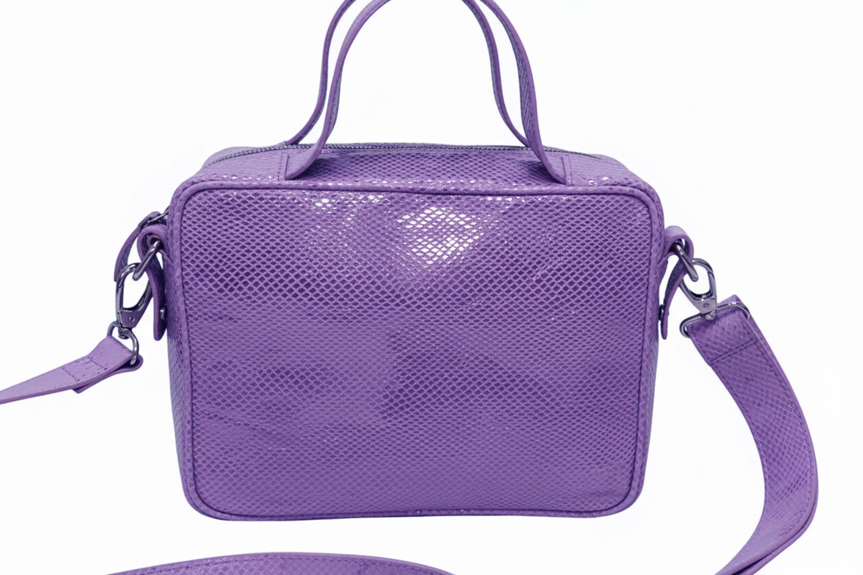 Chic and compact, the FR 63 Mini Box Sling Bag is crafted from premium textured leather in a vibrant purple shade. Its structured silhouette gives a modern, polished look, while the dual top handles and detachable adjustable sling strap offer versatile carrying options.
