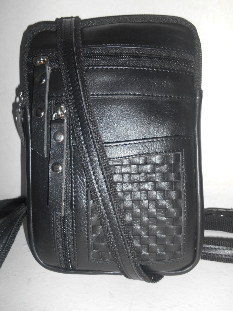 This versatile crossbody bag is crafted from supple black leather, designed for the modern minimalist who values organization. It features a unique basket-weave leather patch on the front for a touch of texture. With three external zippered pockets and a slim profile, it provides quick access to your phone, passport, and wallet. The adjustable, reinforced strap ensures comfort whether worn over the shoulder or across the chest.